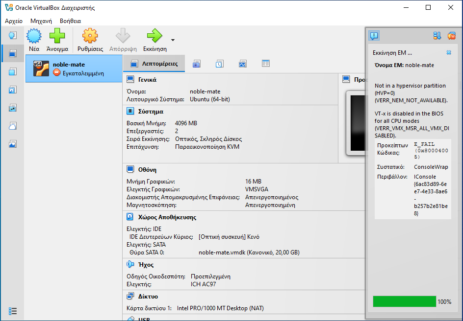 Σε περίπτωση που κατά την Εκκίνηση εμφανιστεί το μήνυμα της διπλανής εικόνας, θα πρέπει από το BIOS/UEFI να ενεργοποιήσετε την επιλογή Intel Virtualization Technology (VT-x). Το αντίστοιχο μήνυμα για AMD CPU θα είναι: AMD-V is disabled in the BIOS.
